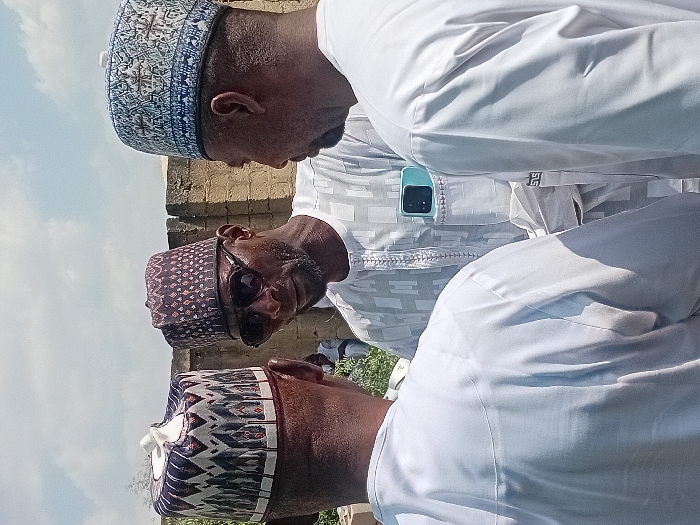Three men dressed in white attire and traditional embroidered caps engage in conversation. One man wears sunglasses. A phone is visible on the middle man's chest pocket. A building appears in the background under a blue sky. The overall perspective is from slightly above, looking down at the group. The photo appears to be rotated on its side.
