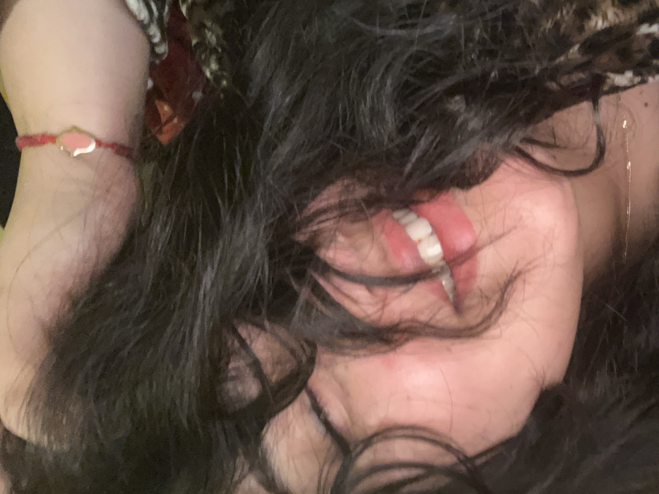 A woman lies sideways, her face partially obscured by dark, curly hair. Her skin is fair and the exposed part of her mouth reveals a smile with white teeth. A red bracelet with a gold charm adorns her arm. She wears a patterned scarf or head covering. The image is slightly out of focus and has a soft, diffused lighting.