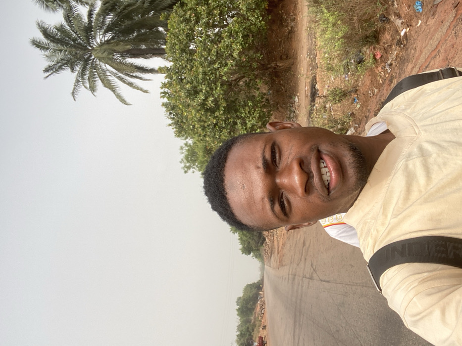 The image captures a male individual in the foreground, facing the camera with a slight smile, positioned in Okura, Nigeria