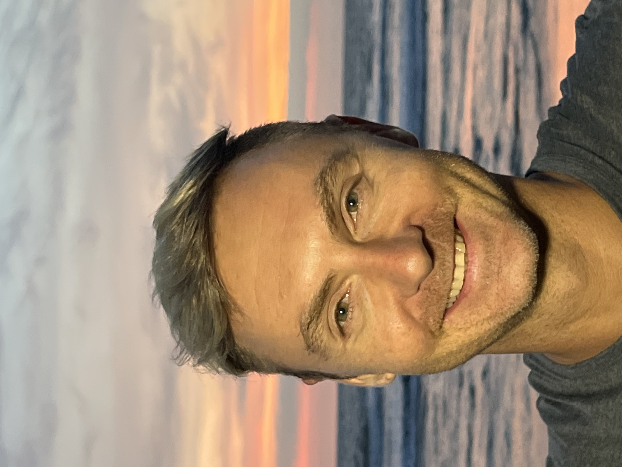 The scene captures an adult male in a close-up, selfie-style portrait, positioned against a coastal backdrop in Kerobokan Kelod, Indonesia. The subject, with fair skin, light-colored eyes, and short, light brown-to-grey hair, is seen from the chest up, wearing a dark grey t-shirt. He displays a smiling expression, revealing upper teeth, with light stubble on his lower face. The background consists of an ocean with visible waves, meeting a horizon line under a sky characterized by sunset or sunrise colors including pale orange, pink, and light blue, interspersed with clouds. No other individuals or significant objects are present within the frame. The action is a self-portrait; no interaction with others is depicted.