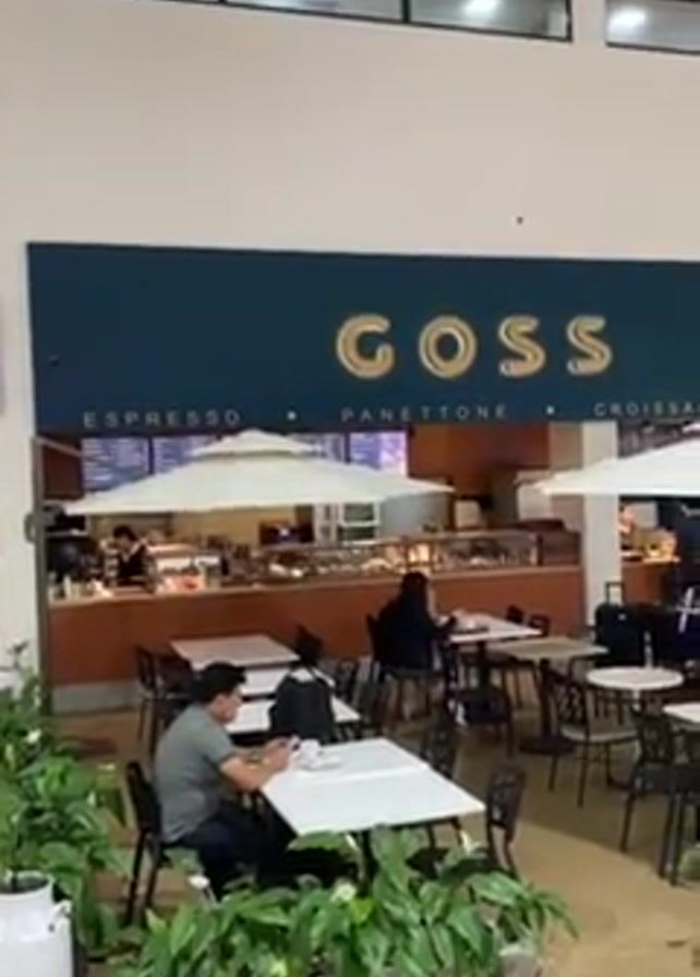 Goss cafe located within an airport. The cafe's sign is above the food counter and the cafe’s seating area. There are white tables and black chairs, potted green plants, and white umbrellas. Several people are sitting at the tables. A man in a gray shirt and jeans walks across the scene from left to right.