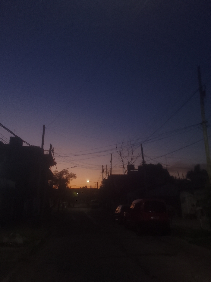 A street scene at dusk, the sky transitioning from deep blue to orange near the horizon. Silhouetted buildings and power lines frame the view down the street, where a faint street light glows. The foreground is dark, with a few parked vehicles visible on the right side. A bare tree and other obscured foliage add to the silhouette effect. The overall mood is peaceful and quiet.