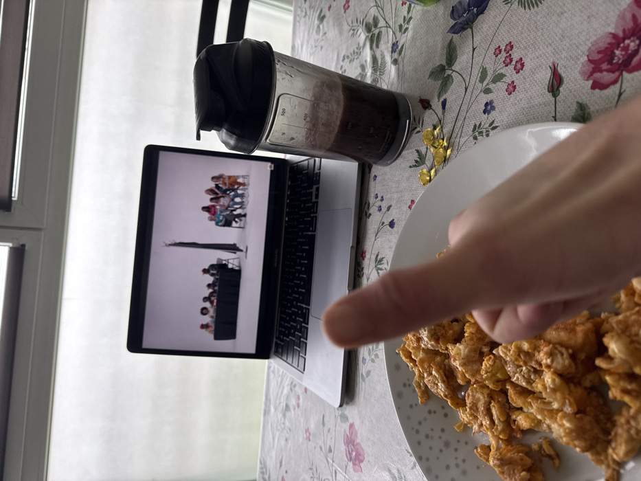 The scene depicts an indoor domestic setting in Rennes, France. A silver laptop computer, open and displaying a video, occupies the mid-ground. The video content shows an interior set with a plain white background, featuring two distinct groups of people: five individuals are seated behind a black table on the left side of the screen, and five individuals are seated on chairs to the right. A dark, vertical object stands upright between these two groups. To the right of the laptop, a clear plastic shaker bottle with a black lid contains a dark brown liquid and displays volume markings, including '500'. A white ceramic plate in the lower foreground holds a serving of scrambled eggs, notable for its orange-red seasoning. A light-skinned human hand enters the frame from the lower-left, presenting a 'thumbs up' gesture over the plate. The surface beneath the objects is a light-colored tablecloth patterned with pink, blue, and purple floral motifs and green foliage. Several yellow, oval-shaped capsules are scattered on the tablecloth to the right of the plate.