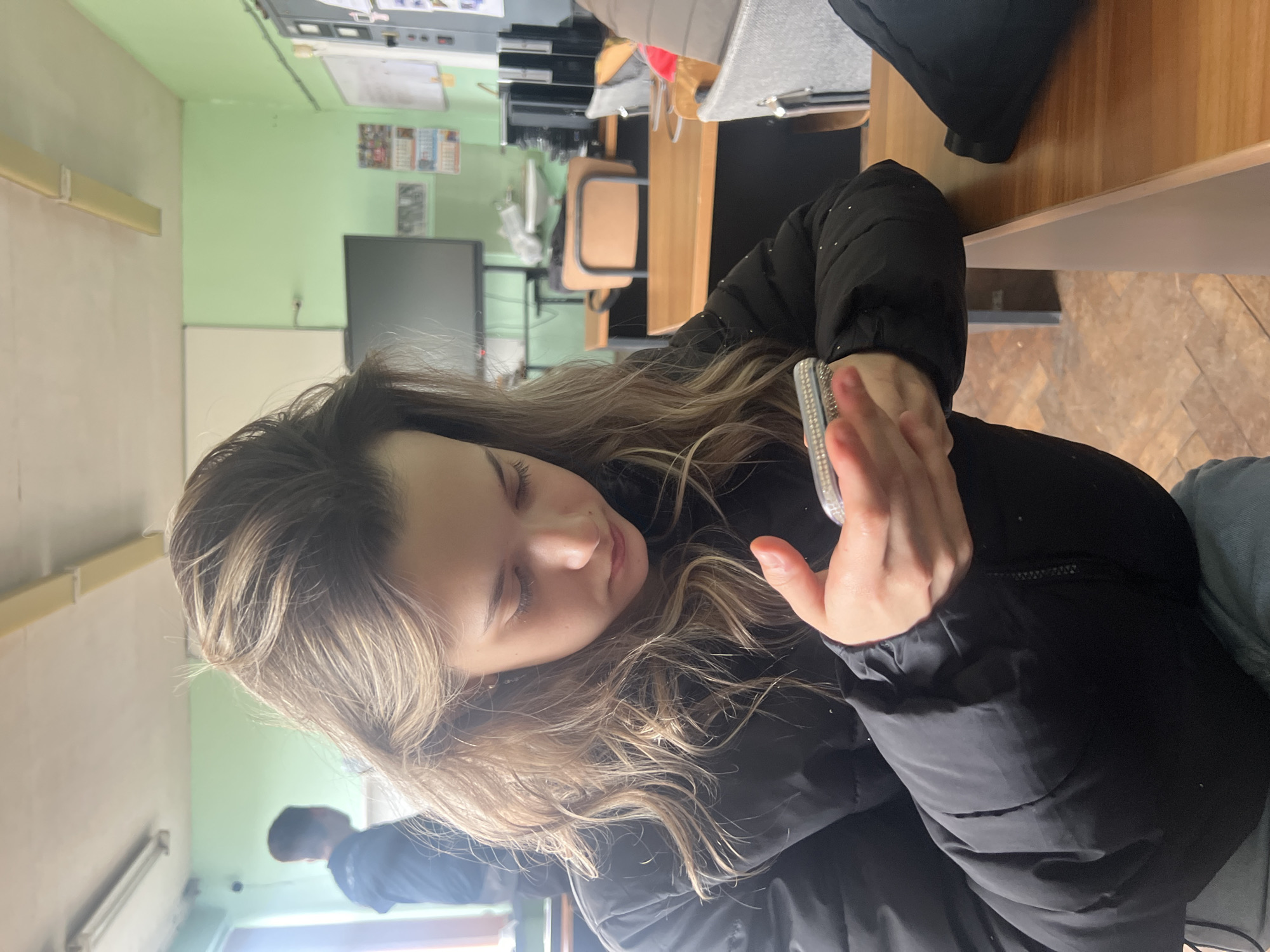 A young female, appearing to be a teenager or young adult, is seated at a light-colored wooden-topped desk, positioned with her upper torso and head directed slightly left of center. She possesses long, wavy, light brown hair with blonde highlights and is dressed in a black puffer jacket over light blue jeans. Her attention is focused downward on a silver-colored smartphone, which she holds with both hands. In the blurred background to the far left, a male figure wearing a dark hooded jacket stands near a window, facing away from the camera. The scene takes place within a classroom of an educational institution in Cherven Bryag, Bulgaria. The room features light green walls, a white ceiling with rectangular fluorescent light fixtures, and a partially visible brown tiled floor. A large flat-screen monitor is mounted on the left wall next to a white board. Desks with wooden tops and light-colored bases, along with brown chairs, populate the room. Further back on the right, desktop computer equipment and additional desks are visible. The right wall displays calendars or posters and a grey metal cabinet. A white basin or sink-like object is also partially visible in the mid-ground on the right.