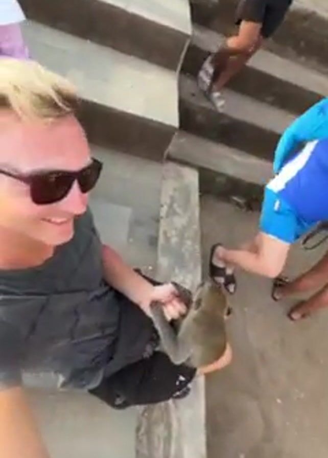 The video depicts an interaction between people and monkeys. A woman is seated and holding a monkey. A man in a blue and turquoise shirt approaches and smiles. He appears to be filming. A close-up shows the monkey eating something. The camera then shifts to a man with sunglasses, who is also smiling. The scene takes place on a staircase with other people around, including someone wearing red. The environment appears to be outdoors with trees visible.