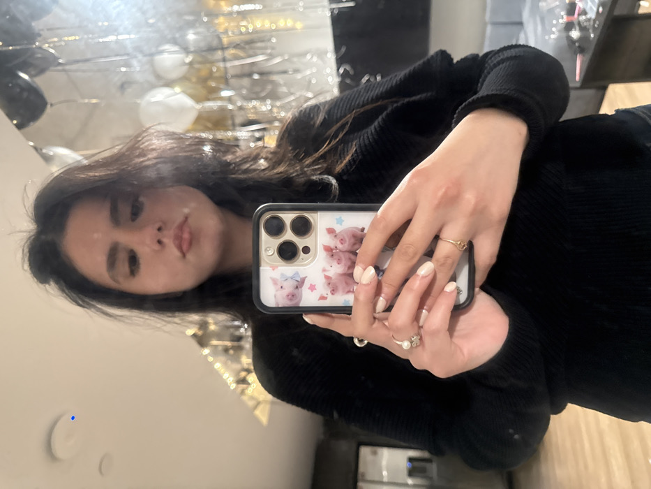 A young adult female is depicted in a mirror selfie, holding a silver-colored iPhone 15 Pro or Pro Max in a transparent case. The phone case features illustrations of three small pigs at the bottom and one pig with a blue bow at the top, accented by scattered stars. The individual has dark, shoulder-length, slightly disheveled hair and wears a black, long-sleeved, ribbed knit top. Her hands, adorned with pale, off-white nail polish, hold the phone. A ring with a pearl-like object is visible on her left ring finger, and a thin, gold-toned ring, possibly knot-shaped, is on her right ring finger. The reflected background reveals an indoor residential or event space decorated for a celebration. Black, white, and gold balloons, along with gold streamers or garland, are visible near the ceiling. To the right, a section of a light-colored sofa and a dark surface, possibly a coffee table with small, reflective items, are present. A vague reflection of a doorway or open room is discernible on the far left. The location is Austin, United States of America.
