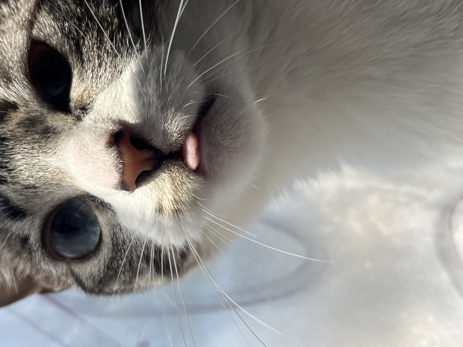 A close-up portrait captures a domestic cat, identified as being in Málaga, Spain. The cat features a white chest and lower face, contrasting with tabby grey, brown, and white markings across its forehead and around its right eye (viewer's left). Its left eye (viewer's right) is light blue, partially shadowed. The right eye is mostly obscured by deep shadow. A pink, slightly moist nose with darker pigmentation is central. A small, pink tongue is extended from the cat's mouth. Numerous long, white vibrissae emanate from its muzzle. The lighting is strong, originating from the upper left, creating distinct highlights and shadows on the cat's fur. The background is highly blurred, presenting light blue and white tones, indicative of an indoor setting with ambient light. No other subjects or distinct objects are visible.