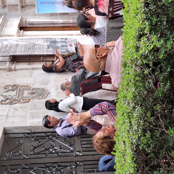 The scene depicts an outdoor gathering in Arequipa, Peru, with multiple individuals assembled in front of a colonial-style building constructed from light-colored sillar stone. In the immediate foreground, a dense green hedge partially obstructs the view of seated attendees. Seven distinct individuals are visible. On the left, a woman with brown hair and glasses, wearing a plaid shirt, claps with both hands raised. To her right, a man in a light purple long-sleeved shirt stands, looking towards the right. Adjacent to him, a woman in a white blazer and dark pants holds a white mobile phone in her left hand while clapping with her right. Behind her, a man with short grey hair and glasses, clad in a dark suit jacket, is seated in a dark red plastic chair, also clapping. Next to the seated man, leaning against the stone wall, a woman in a floral dress and sunglasses claps. In the lower right, a bald man wearing sunglasses and a light-colored shirt is seated, viewed from behind. Another woman with dark hair tied back, wearing glasses, is seated behind him, also viewed from behind. The building's stone wall features an ornate black wrought-iron gate on the far left, a carved stone coat of arms/crest, and a narrow window with decorative metal bars. Two vertical banners hang on the wall: one displays black and white images and text in Spanish, notably "Guillermo Zegarra Rodriguez" and "TIEMPO Y MEMORIA"; the other, partially visible on the far right, depicts the Eiffel Tower against a blue background. A wooden doorway is positioned to the right of the first banner. The ground in the mid-ground consists of a reddish-brown paved surface. Multiple individuals are actively clapping, suggesting an event is concluding or being celebrated.