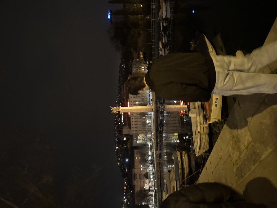 The image presents a nighttime urban waterfront scene in Grad Rijeka, Croatia. In the foreground, a paved stone quay runs along the lower left. Two individuals are present on the quay. A person on the far left is partially visible from the back, wearing a dark, possibly padded jacket. A second individual, a male with dark hair, stands centrally with his back to the camera, wearing a dark jacket and light-colored jeans, looking across the water. The midground features a calm body of water with approximately ten small, white-hulled boats moored. One boat clearly displays the registration "RK 1183" on its stern. The water reflects the artificial lights of the city. In the background, across the water, the cityscape of Rijeka is illuminated. A prominent, tall, light-colored monument, identified as the Monument to the Liberators of Rijeka, stands on a column topped with a multi-figure sculpture. Various buildings are visible, illuminated by streetlights and interior lights. Distant lights extend up dark slopes, indicating higher terrain beyond the immediate urban area. The sky is dark, devoid of stars or moon, consistent with nighttime conditions.
