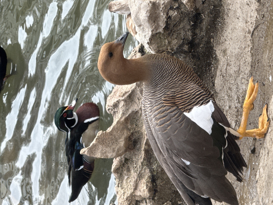 The image depicts an outdoor scene in Leskovets, Bulgaria, featuring waterfowl near a body of rippled water. In the foreground, a female Upland Goose (Chloephaga picta) stands on a light grey, textured ground surface, facing right in profile. This bird exhibits a uniform reddish-brown head and neck, finely barred grey and brown plumage across its breast and flanks, dark grey wings with distinct white patches on its sides, and bright orange-yellow webbed feet. Behind the goose, light-colored, textured rock formations delineate the edge of the water. Within the water, a male Wood Duck (Aix sponsa) is visible, characterized by its iridescent green head, white facial markings, red eye, and dark, multi-colored body plumage. A second bird, partially submerged and appearing lighter in color, is visible at the water's edge to the far right, and a darker, indistinct bird floats further back in the water.