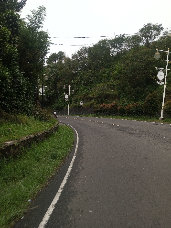 The image displays a curving asphalt road through a hilly, vegetated area in Deothang, Bhutan, under an overcast sky. The road, which features a solid white line on its right edge and a less distinct dashed center line, curves to the left from the foreground. On the immediate left, a stone retaining wall supports an embankment covered in green grass and dense foliage. Further left and along the hillside, tall green trees dominate. On the right side of the road, several white street lamp posts with decorative, circular cream-colored signs and lanterns are spaced along the curve. The hillside to the right is also densely covered with green trees and smaller reddish-brown bushes. A single individual on a dark motorcycle, wearing a white shirt, is visible in the distance on the left side of the road, navigating the curve away from the viewer. Overhead power lines are visible against the sky in the upper middle portion of the image.