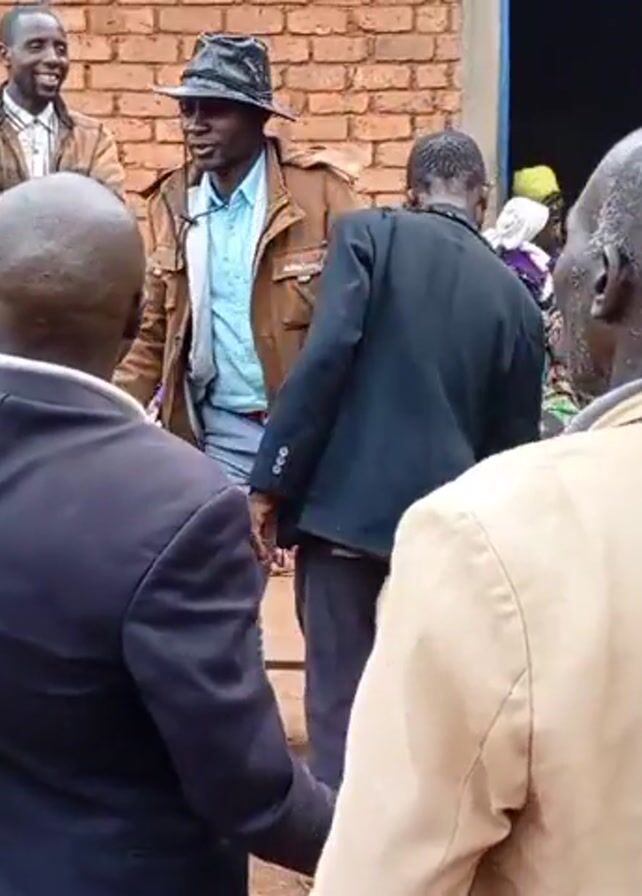 gathering of people in what appears to be a village or rural setting. Many women are seated together, some on stools, wearing colorful headscarves and dresses. A group of men, dressed in jackets, suits, and hats, stand near the women. One man is taking photos with his phone. Another man gestures with his hand as if addressing the group. A brick building with a window is visible in the background. Some people are seated on chairs on a grassy slope. The ground is reddish-brown dirt. The overall atmosphere is casual and social.