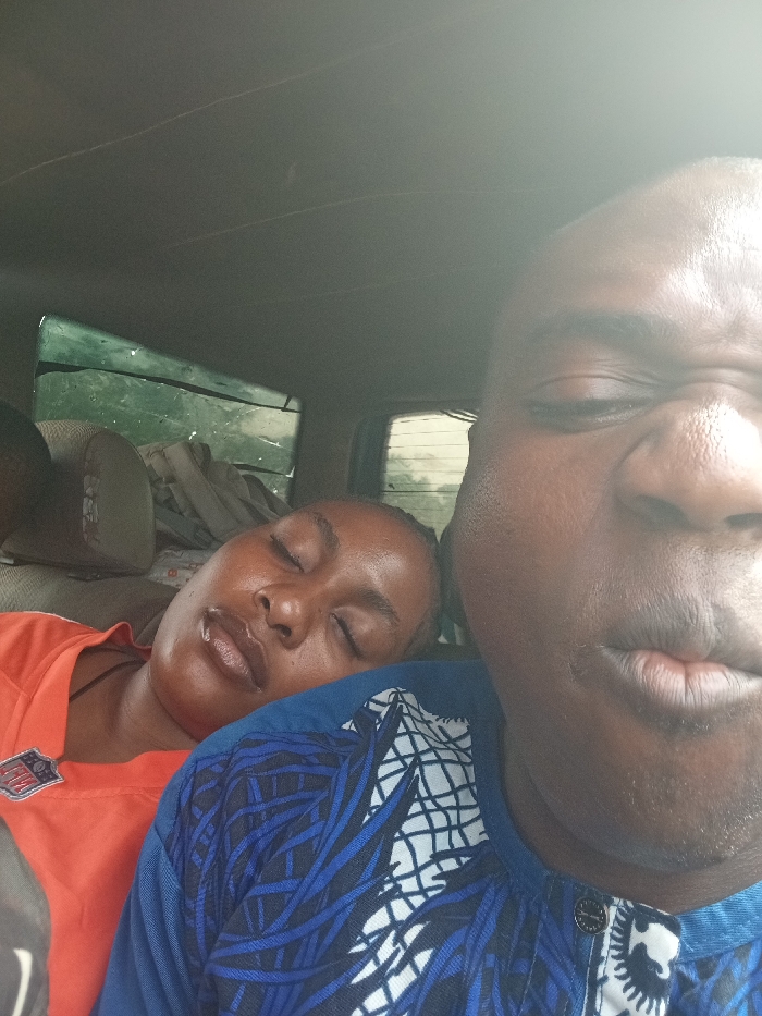 The image displays two dark-skinned individuals inside a vehicle in Gumel, Nigeria. In the foreground, a male with closed eyes and a partial view of his face wears a blue and white patterned collared shirt. To his left, a female with closed eyes and braided hair rests her head on his right shoulder, appearing to be asleep. She wears an orange short-sleeved top featuring an "NFL" shield logo on the left sleeve. The vehicle's interior shows a gray headliner, seatbacks, and through the rear windows, green foliage and diffuse daylight are visible. Objects, resembling luggage, are stacked on a seat behind the female subject.