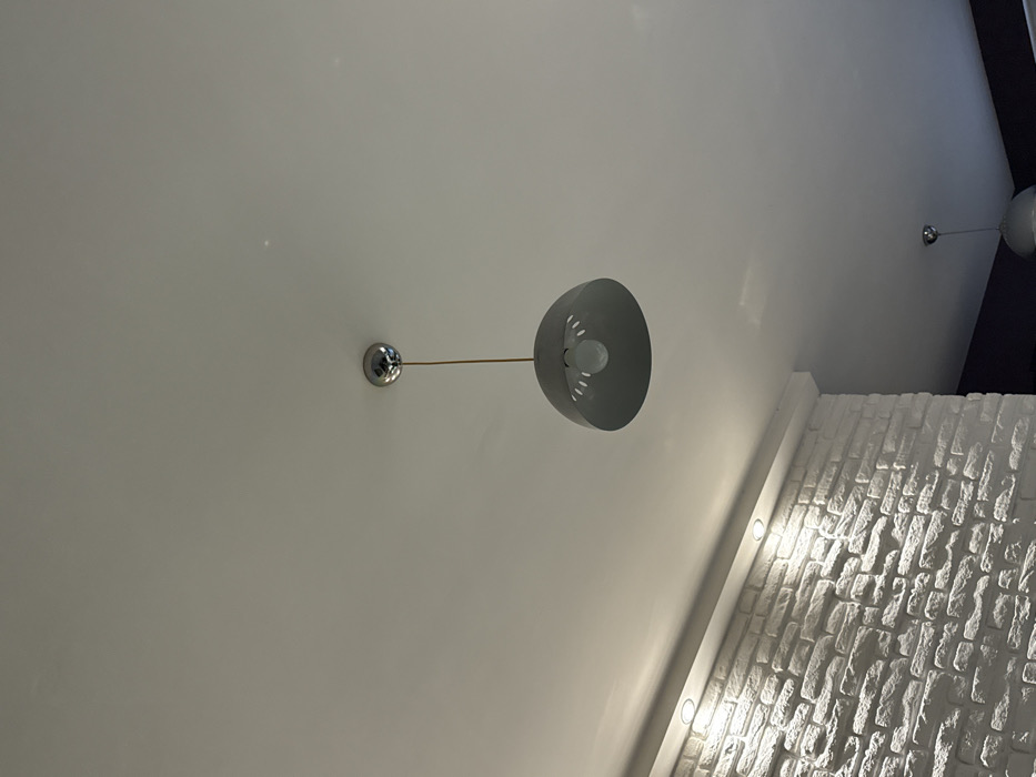 The scene depicts an indoor environment in Varna, Bulgaria, characterized by its ceiling and lighting fixtures. The dominant feature is a grey, semi-spherical pendant lamp suspended from a white ceiling. This lamp features a chrome-finished circular ceiling rose, from which a light brown cable extends downwards, supporting the metal shade. A single, clear bulb is visible within the open base of the shade. Towards the lower-left quadrant of the image, a section of a white-painted, rough-hewn brick wall is visible, providing a textured surface. Along the top edge of this brick wall, beneath the main ceiling, a recessed lighting soffit or ledge contains at least three circular spotlights, with two of them illuminated and casting light onto the brickwork. In the lower-right corner, partially obscured, a second, similar grey pendant lamp with a chrome fixture is visible, hanging at a lower elevation than the primary lamp. The ceiling is uniformly white, and no individuals, direct actions, or interactions are present in the frame.
