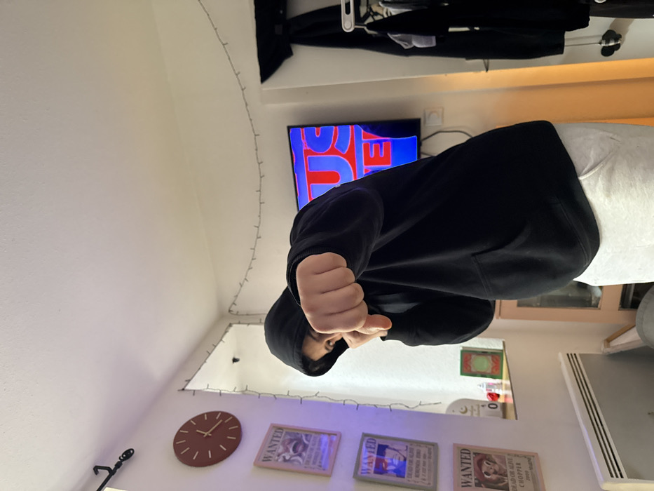 A single individual is positioned centrally within an indoor residential room. The person wears a black hooded sweatshirt and light grey sweatpants, with their face partially obscured by the hood; eyes are visible looking towards the camera. Both fists are raised in front of the body, with the right fist (from the viewer's perspective) extended forward in a protective or aggressive posture. The room has white walls and a white ceiling. On the left wall, a reddish-brown circular wall clock with no numerals indicates approximately 10:45. Below the clock, three framed "WANTED" posters, consistent with the *One Piece* manga/anime series (featuring characters like Monkey D. Luffy, Roronoa Zoro, and Tony Tony Chopper), are vertically aligned. A white panel heater is visible at the bottom of the left wall. A string of small white fairy lights is draped along the upper wall perimeter, adding a blueish hue to the lighting. On the back wall, a flat-screen television is mounted, displaying a screen with large, bright red and blue letters, which appear to spell "US" or "TUS." A light-colored wooden furniture piece is partially visible beneath the television. To the right, a black clothes rack holds dark garments. Decorative items, including a white crescent moon ornament, a red object, and a small green framed item, are present on a shelf or surface on the left side of the room. There are no specific visual cues in the image to confirm the location as Strasbourg, France; it presents as a typical indoor residential space.