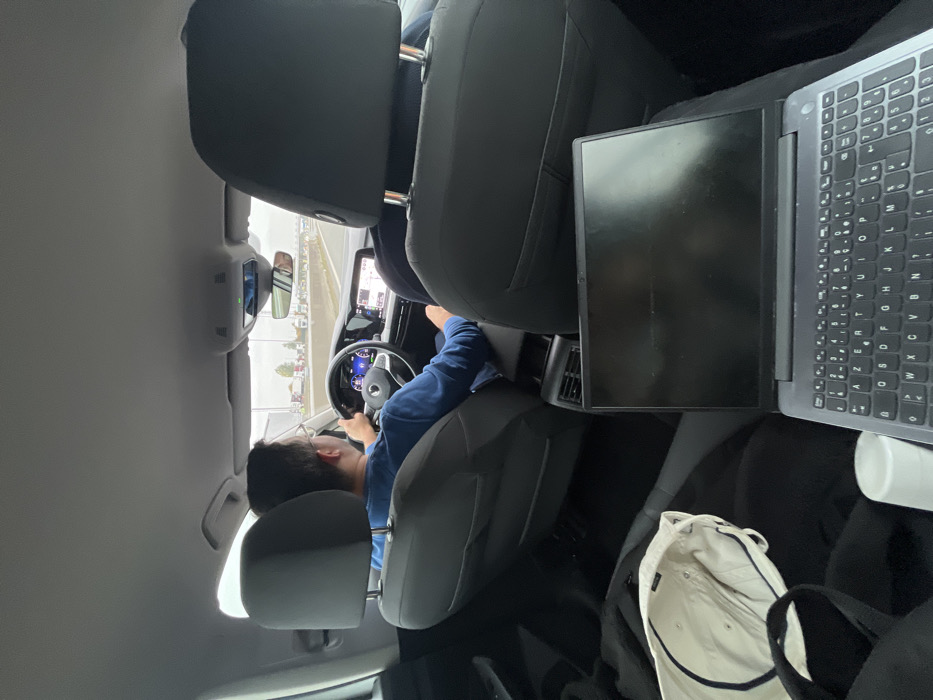 Inside a car, a man drives on a highway. Seen from the backseat, the driver wears a blue shirt. A passenger sits beside him. A laptop rests on the back seat, with a white cap and a cup nearby. The car is moving, as indicated by the road visible through the windshield. The interior of the car is primarily gray and black.