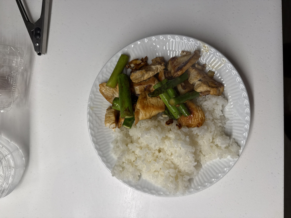 - "A white plate filled with white rice, sliced chicken, and asparagus spears sits on a white countertop" by FM-iAQ8L2, licensed under CC BY 4.0