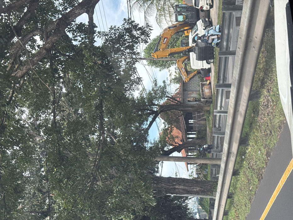 This image captures a roadside scene in Sukawati, Indonesia, under a partly cloudy sky partially visible through a dense canopy of green foliage. In the immediate foreground, a metal guardrail separates the viewer's position from an adjacent roadside area. A yellow solid line is visible on the paved road surface to the left of the guardrail, suggesting a roadway. Beyond the guardrail, on the right, a light blue motor scooter occupied by one individual wearing a dark helmet and a light-colored long-sleeved shirt is positioned facing left. Further left, a darker-colored motor scooter, also occupied by one helmeted individual, is partially visible behind a tree trunk and a utility pole, also facing left. The roadside area features a patch of grass. In the mid-ground, a traditional Indonesian-style building stands with a prominent reddish-brown terracotta-tiled, multi-tiered roof and visible pillars. Its facade exhibits decorative elements. To the right of this building, two large yellow excavators, branded "XCMG," are parked. Between them, a white panel van is visible. A white passenger car is partially observable to the far right. Miscellaneous items, including a wooden crate and red buckets, are scattered on the ground near the parked vehicles. Utility poles and overhead power lines traverse the scene above the traditional building and parked vehicles. Several large trees with substantial trunks frame the scene, their foliage dominating the upper two-thirds of the image.