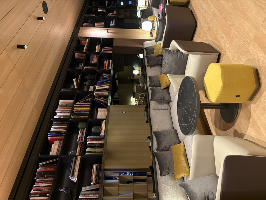 A contemporary lounge features a long, gray sectional sofa adorned with gray and yellow cushions, divided by a black marble-topped table and a yellow hexagon ottoman. A tall, black bookshelf lines the left wall, filled with books and decorative items. The right side is a light wood floor. Mirrors are placed on the far wall, creating a repeating reflection of the space. Recessed and accent lighting is scattered throughout the area.