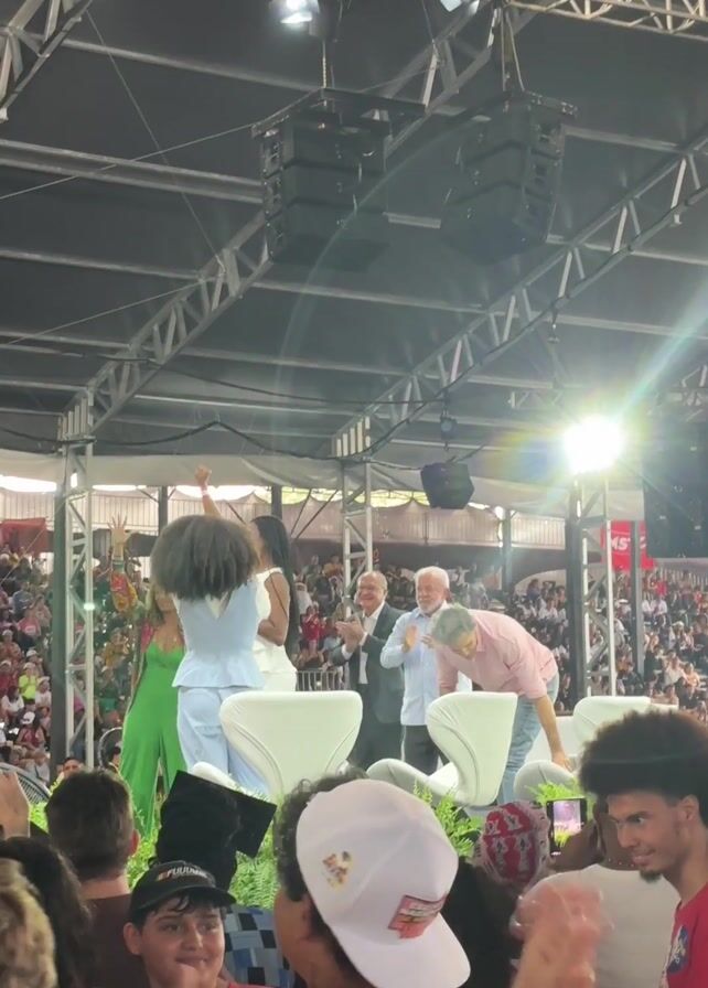 Here's a detailed description of the video: The video captures a scene from an event with a large crowd. Several people are on a stage, including two women in colorful outfits, two men in suits, and one man in a light blue shirt and jeans. The crowd is cheering and clapping as the people on stage acknowledge them. The stage is decorated with green leafy plants and white chairs. The event appears to be taking place outdoors under a large metal structure that supports lighting and speakers. Many audience members are holding up their phones to record the event. In the foreground, several people are also cheering and clapping, with one person wearing a white cap that says "VOTO" on it.