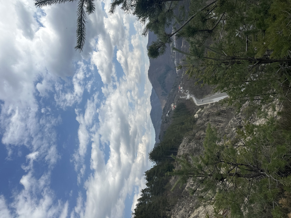 The image depicts a panoramic view of a mountainous landscape near Srednogortsi, Bulgaria, under a partly cloudy sky. The upper portion of the frame features a blue sky interspersed with white and light grey stratocumulus clouds. The foreground is dominated by the green needles and branches of several pine trees, partially obscuring the view from the lower right and left. A steep, rocky hillside, sparsely vegetated, descends from the left into a valley. A dark grey asphalt road with visible white lane markings and guardrails winds through the valley from the lower right towards the center-left, with one white passenger vehicle traveling away from the viewer. On a distant hillside, several buildings with distinct orange-red roofs are visible amidst trees. In the background, multiple layers of mountains with forested slopes rise under the cloudy horizon. No individuals are visible. The scene is illuminated by diffused natural light, indicating daytime.
