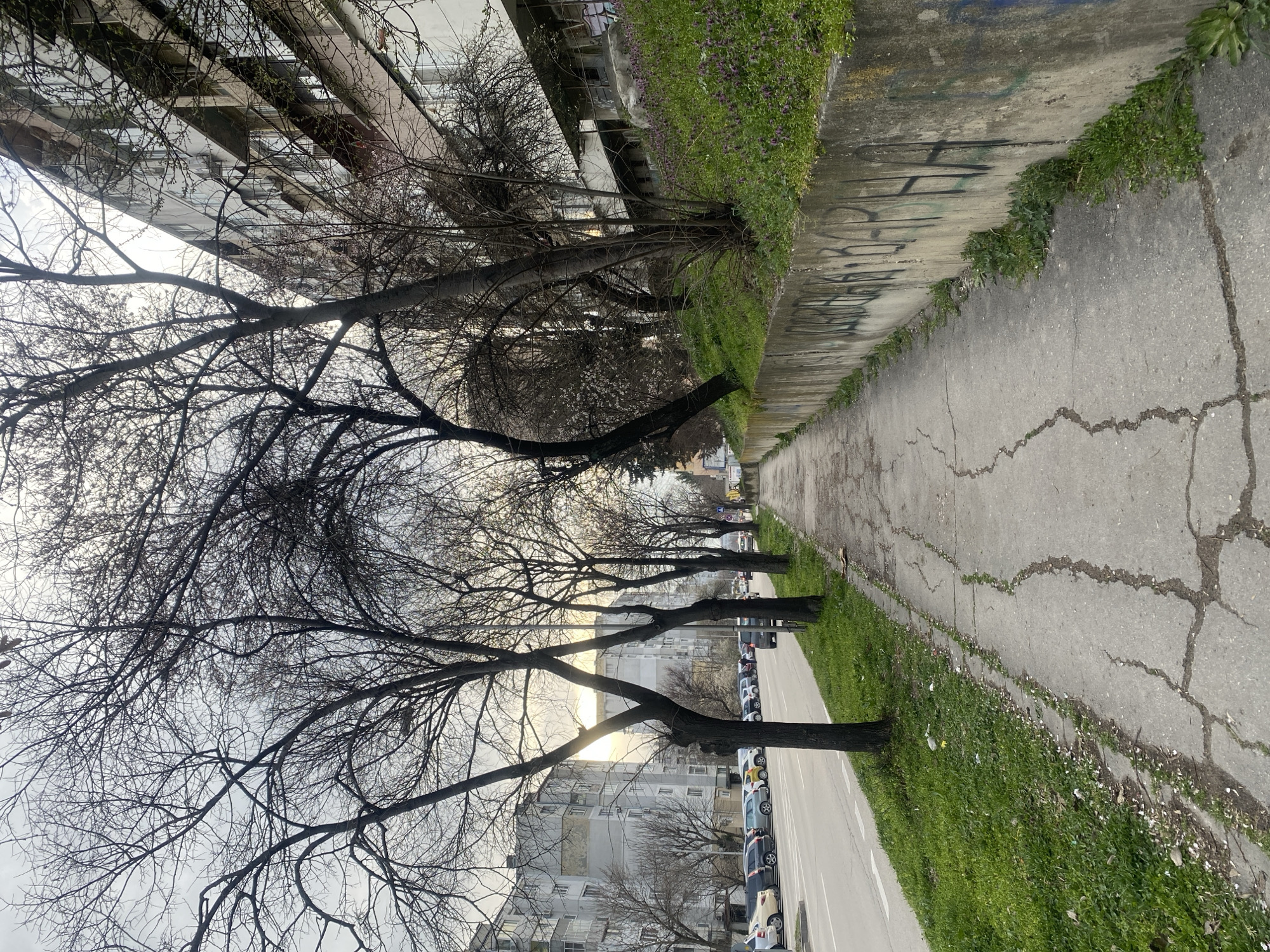 This image depicts an urban street scene in Varna, Bulgaria, under an overcast sky with diffused sunlight, indicating late afternoon or early morning conditions in late winter or early spring. In the foreground, a cracked concrete sidewalk extends from the lower center towards the upper right, with weeds growing through its fissures. Immediately to the right of the sidewalk, a concrete retaining wall, approximately 1.2 meters in height, is extensively covered with black and multi-colored graffiti. Above this wall, an upward-sloping grassy embankment is visible, densely populated with green grass and numerous clusters of small purple flowers. Deciduous trees with bare branches and visible buds line the right side of the sidewalk and the narrow grassy median separating the sidewalk from the road. To the left of the sidewalk and grassy median is an asphalt road with visible white dashed lane markings. A continuous line of parked vehicles, consisting of various models and colors including white, grey, blue, yellow, and black, occupies the left side of the road. Further down the street, additional vehicles are observed in motion. In the background, multi-story residential apartment buildings, characterized by numerous windows and balconies and a light-colored, somewhat worn facade, line the left side of the street behind the parked cars. No individuals or specific interactions are clearly identifiable within the frame.