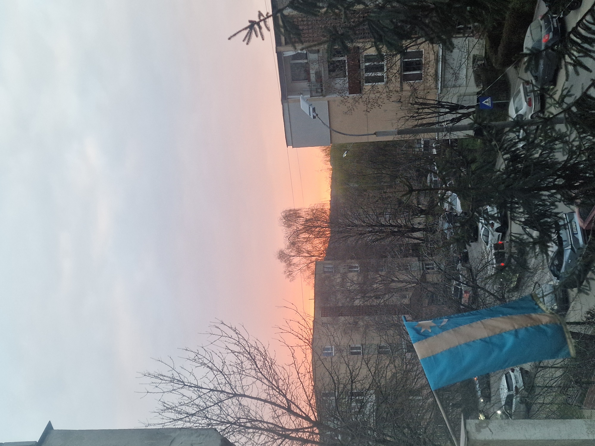 The image displays an urban residential scene within the city of Odorheiu Secuiesc, Romania, at either dawn or dusk under an overcast sky. The upper two-thirds of the frame are dominated by the sky, which transitions from a light grey-blue at the zenith to a gradient of pale pink and orange hues along the horizon, indicating a low sun position. In the midground, a series of multi-story apartment buildings, typically constructed from concrete or stucco, are visible. These structures feature multiple windows and balconies. Numerous deciduous trees, currently bare of foliage, are interspersed among the buildings, their skeletal branches prominent against the colorful sky. Evergreen trees, likely conifers, are present in the foreground on the right and extending into the midground. Below the apartment buildings, an asphalt street is lined with numerous parked passenger vehicles, including various models of sedans and hatchbacks. Several vehicles display Romanian license plates. A street light pole with a modern luminaire stands in the midground, and a blue square pedestrian crossing sign with a white walking figure is visible near the roadway. In the immediate foreground on the left, a segment of a light-colored concrete building structure is present. Attached to this structure, a Székely flag hangs vertically; it features a blue field with a central golden stripe, an eight-pointed golden star, and a silver crescent moon. No individuals are present, and no activities or interactions are observed within the static environment.