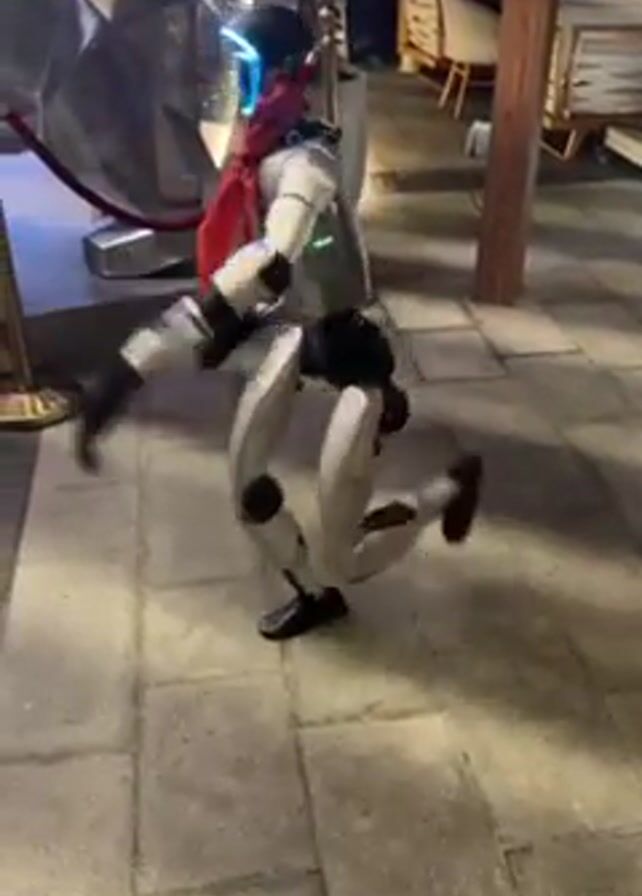 white and black robot dancing on a paved surface