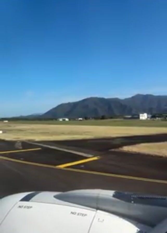 The view from an airplane window shows an airport runway on a sunny day. The wing of the plane is visible in the foreground with "NO STEP" printed on it. The runway is black with yellow markings. Beyond the runway is a grassy field, and in the distance, there are mountains. The sky is clear and blue. There are a few buildings visible in the distance as well. The plane appears to be stationary on the runway.