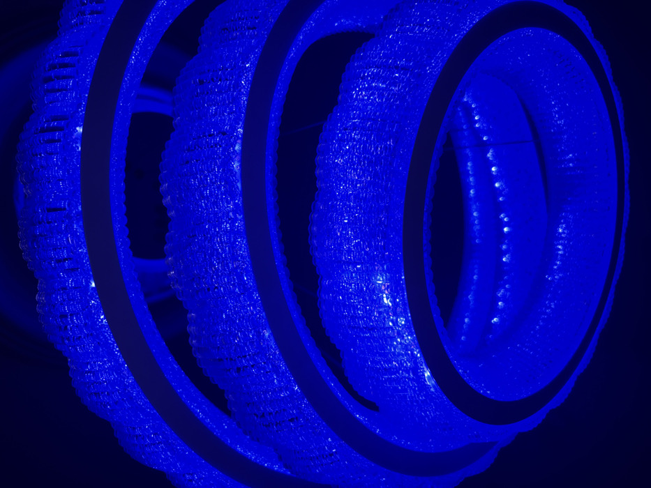 The image presents a multi-tiered circular light fixture illuminated with intense blue light