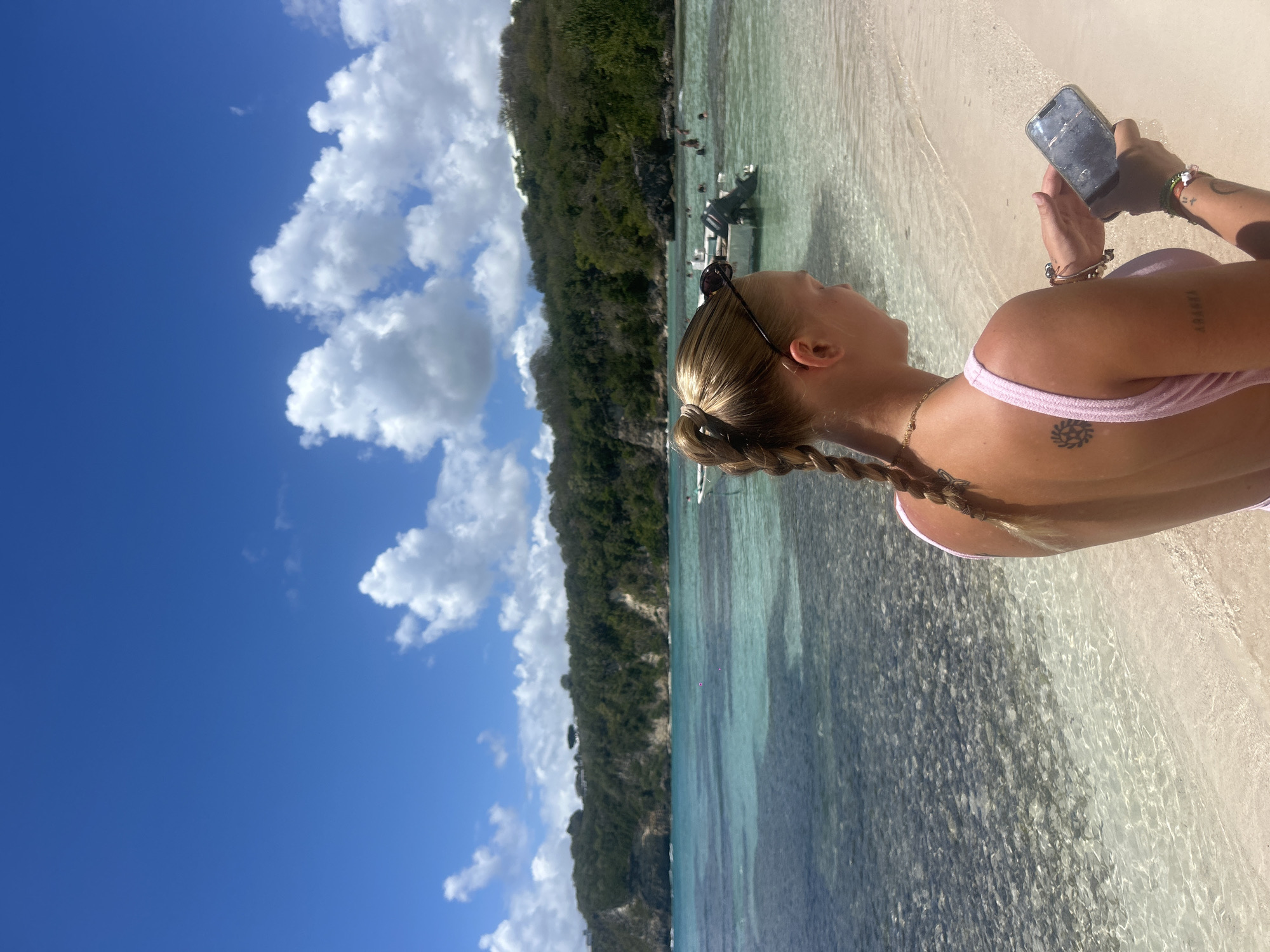 The image displays a sunny coastal scene in Le Gosier, France. A female individual, seen from the upper back and left side, stands on a sandy beach in the foreground. She has blonde hair styled in a high braided ponytail with sunglasses resting on her head. She wears a light pink swimsuit, exhibiting a circular black tattoo on her left shoulder blade and a smaller horizontal tattoo on her left upper arm. She is holding a dark-cased smartphone with both hands, appearing to interact with its screen. The water near the shore is clear and shallow, revealing a textured seabed, and transitions to deeper shades of turquoise and blue further out. In the midground, a white boat equipped with an outboard motor is visible, along with several indistinct human figures swimming or wading in the water. The background is dominated by a steep, lush green hillside or cliff densely covered with trees and foliage, under a bright blue sky dotted with scattered white cumulus clouds. Faint structures are discernible atop the distant hill.