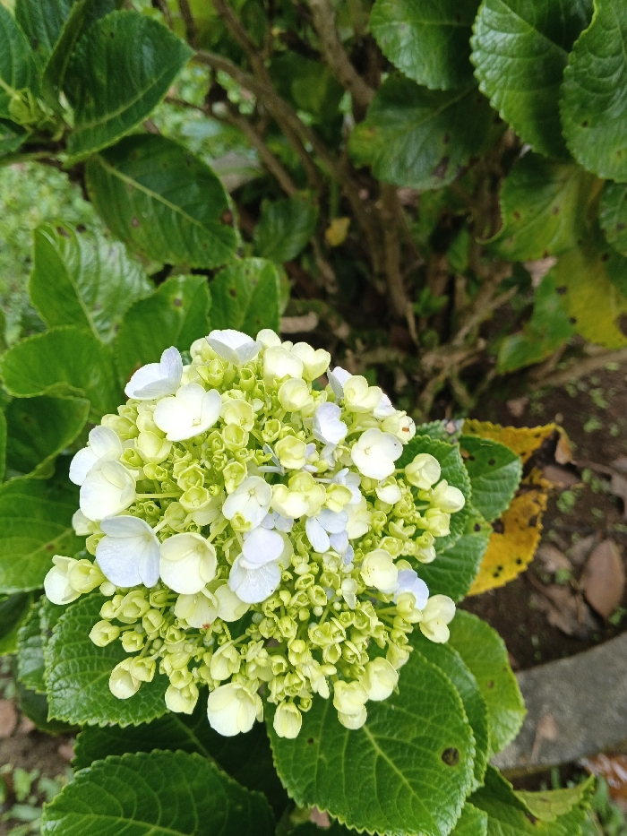 A cluster of pale blue and white hydrangea flowers emerges from bright green leaves. Many unopened buds of the same pale green hue surround the open blossoms. The leaves are textured with deep veins. Behind the hydrangea are the brown branches of the plant and other green leaves, some with yellowing spots. Soil and a hint of a stone surface are visible.