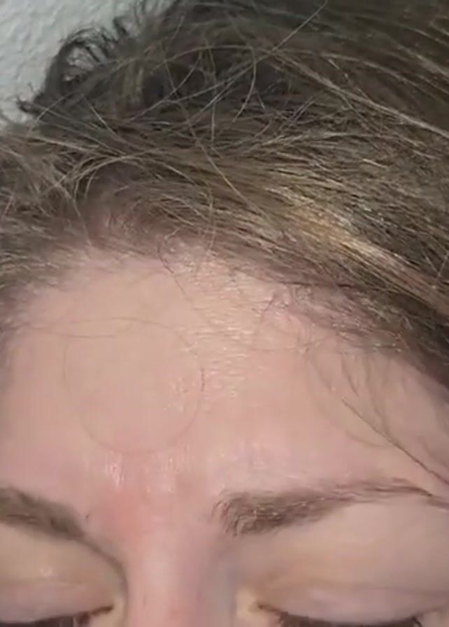 close-up view of a person's face from the forehead to the eyes. The person has fair skin, light brown hair, and blue eyes. The person's eyes widen and then blink. The background is a plain, light-colored surface.
