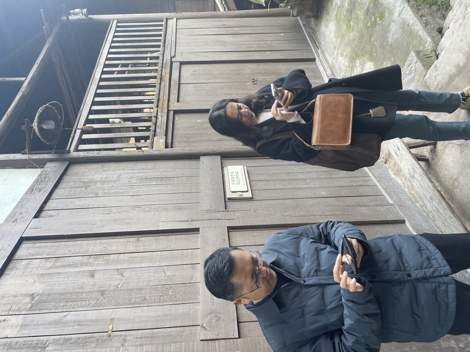 Two individuals stand in front of a wooden structure. The person above, wearing a black coat and jeans, is holding a cell phone and carrying a brown bag. The person below, dressed in a blue jacket and black pants, is also holding a cell phone. The wooden structure includes a staircase and an enclosed balcony. A sign is visible on the wall. The ground appears to be a combination of concrete and stone.