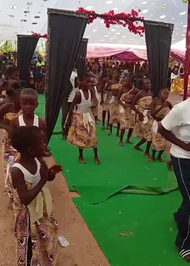 group of children dancing to music on a green carpet under a white tent. The children are dressed in white tank tops and printed skirts. An adult in a white t-shirt and black track pants leads the dance. Some older women dressed in traditional African attire also watch the dance. Money is scattered on the carpet. A crowd of people stands around the edges of the tent. The tent is decorated with black curtains and red flowers.