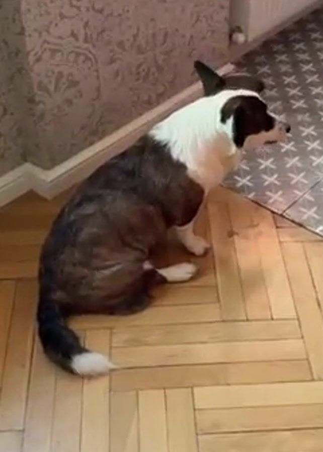 medium-sized dog with brindle, white, and black markings sitting on a parquet floor in the corner of a room