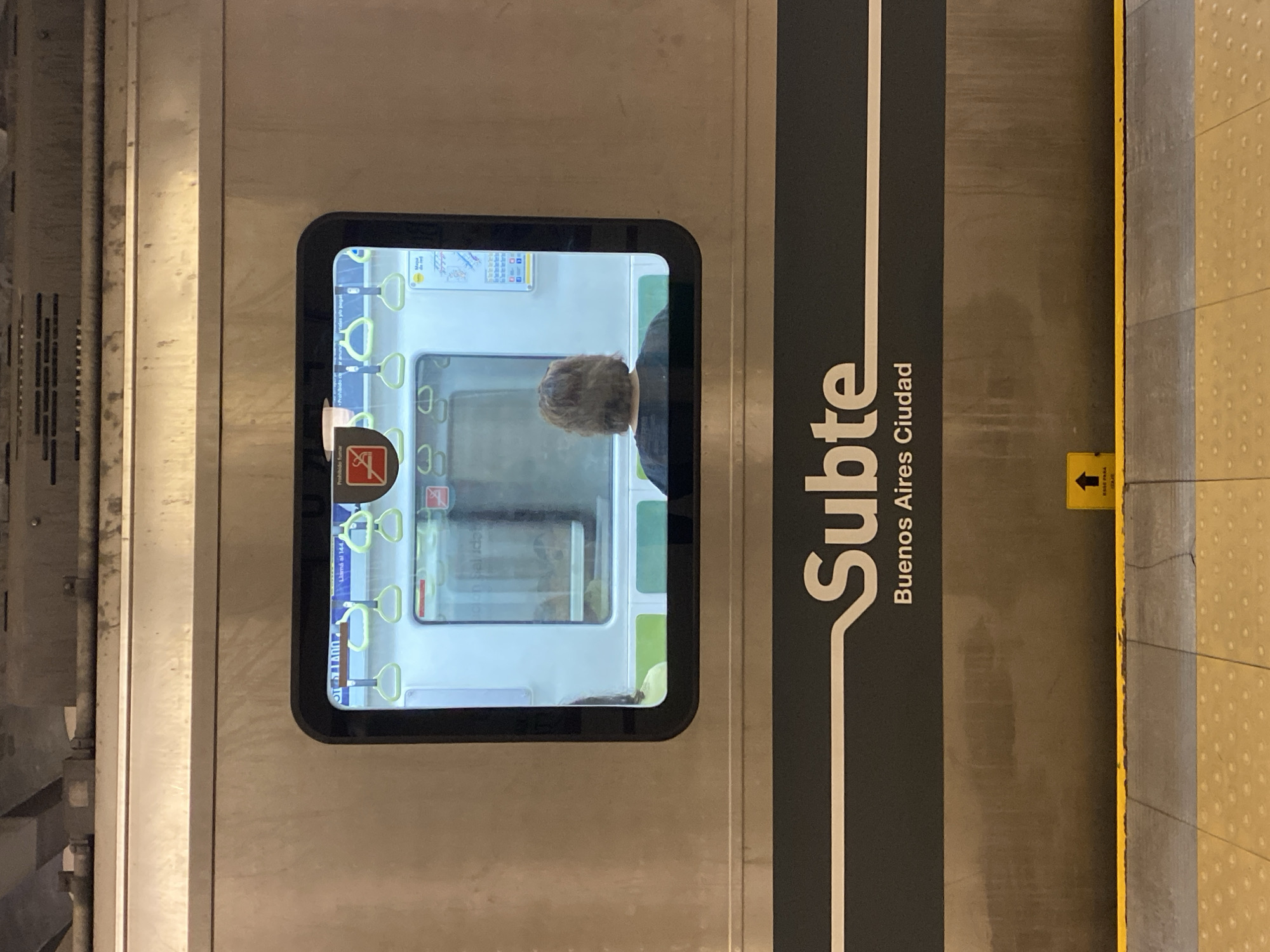 view of the Subte (subway) in Buenos Aires, Ciudad, Argentina. The focus is on a train car's door, with the "Subte" logo and "Buenos Aires Ciudad" printed on a dark gray stripe. A small window on the door reflects the interior of the train, showing passenger seats, handrails, and a glimpse of a person's head with gray hair. A yellow directional arrow is visible at the edge of the subway platform.
