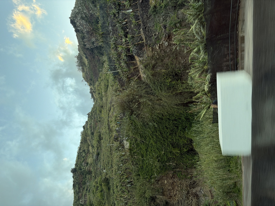 The image depicts a steep, extensively cultivated hillside in Ponta do Sol, Portugal, viewed from a moving vehicle. The upper two-thirds of the frame are dominated by the hillside, which features numerous agricultural terraces constructed from dark stone. These terraces are densely planted with banana trees, many of which display white or light-colored protective bags covering fruit clusters. Scattered throughout the banana plantations are dark utility poles or support structures. Interspersed with the cultivated areas are patches of wilder green vegetation, including dense vines clinging to rock faces, tall grasses, and some scattered trees on the higher elevations. Exposed rock formations are visible on various parts of the hillside. The sky, occupying the top third of the image, is largely overcast with shades of light blue and grey clouds, though patches of brighter, possibly yellowish light are visible on the far right, suggesting either sunrise or sunset. In the immediate foreground, a blurred white concrete barrier, consistent with a road divider or crash barrier, runs horizontally across the lower center. Below this barrier, a dark, blurred surface indicates a road or paved area. The blurring of the foreground elements suggests the photograph was taken from a vehicle in motion. No individuals or discernible human activity are present in the scene.