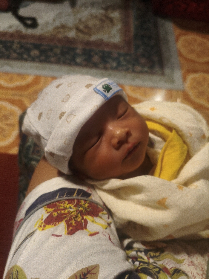 - "An infant is depicted sleeping while being held, positioned in a cradled embrace by an adult whose arm and patterned sleeve are visible on the lower left" by FM-pEKrz1, licensed under CC BY 4.0