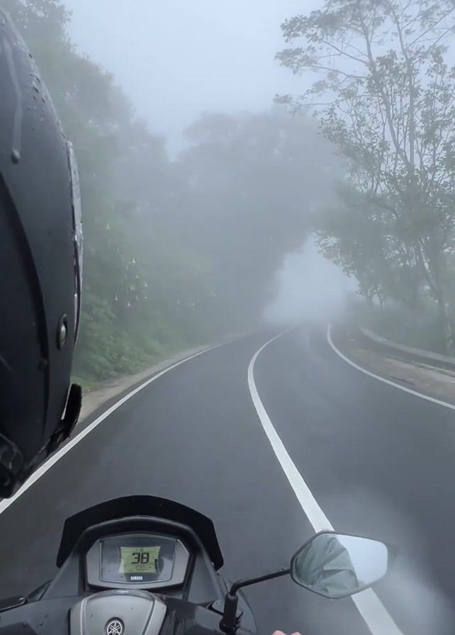 first-person view of someone riding a Yamaha scooter on a wet road shrouded in heavy fog