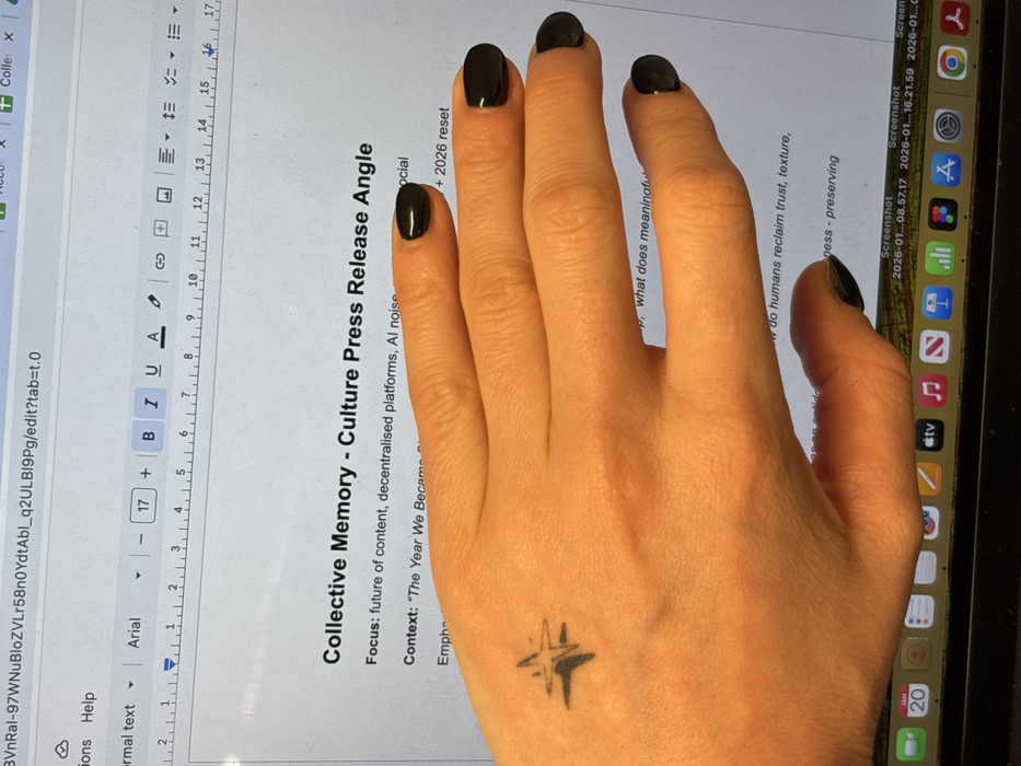 A hand with dark nail polish rests on a laptop screen displaying a document titled "Collective Memory - Culture Press Release Angle." The document mentions focus areas like the future of content, decentralized platforms, and AI noise, with the context being "The Year We Became..." Questions about meaningfulness and reclaiming trust and texture are visible. A star-shaped tattoo is on the back of the hand. Screenshot icons and a dock with apps are seen on the laptop's right side. The document is open in a word processor, showing formatting options like font, size, bold, italics, and underline.
