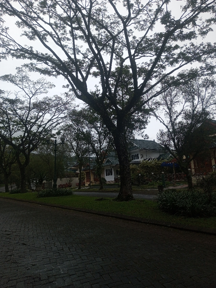 The image depicts a residential or resort-like street scene in Babaliya Mal., India, under overcast daylight conditions. A dark-colored, wet interlocking paver road occupies the foreground, extending from the bottom left to the center right. Immediately adjacent to the road is a strip of vibrant green grass, followed by an array of mature trees with dense, dark green canopies and thick, visible trunks. In the midground, a dark lamppost with two luminaires is situated on the left side, positioned between trees. Beyond the lamppost and trees, several structures are visible. A prominent multi-story building with white walls and a distinctive green-tiled, pitched roof stands centrally. To its right, a portion of a reddish-brown building is visible. An outdoor seating area featuring multiple tables and chairs, partially covered by a blue umbrella or canopy, is situated in front of the white building. Additional residential-style buildings with white walls and green roofs are discernible through the trees further in the background. The area is heavily vegetated with various bushes and smaller trees. No individuals are present, and no actions or interactions are observed.