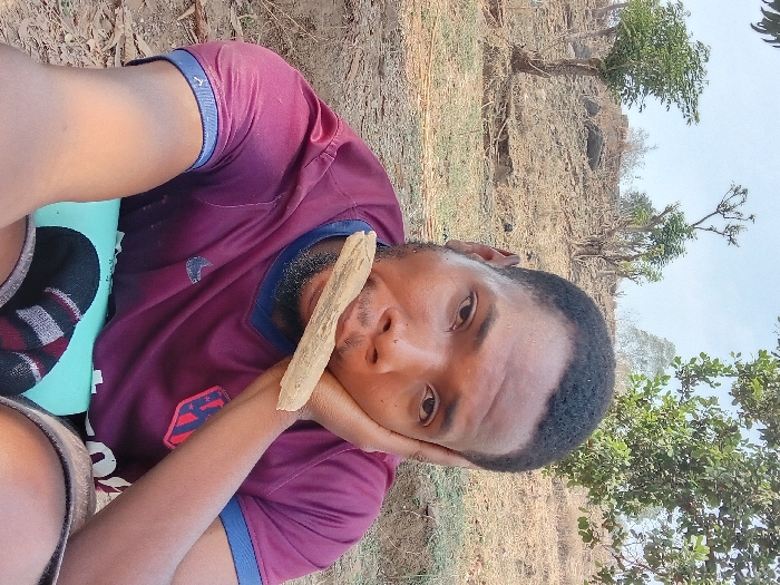 A dark-skinned male subject is depicted outdoors in Kugbo, Nigeria, situated on dry, ascending terrain. The individual, possessing short dark hair and a beard, is observed looking directly forward. He wears a maroon short-sleeved t-shirt with blue collar and sleeve trim, an athletic club logo on the left chest, dark shorts, and black socks with red and white stripes. A light-colored, irregular piece of wood is held horizontally in his mouth. His left hand supports the left side of his face. The background consists of a dry, brown hillside with sparse vegetation, including several trees, some with green foliage and others appearing barren, under a clear, light blue sky.