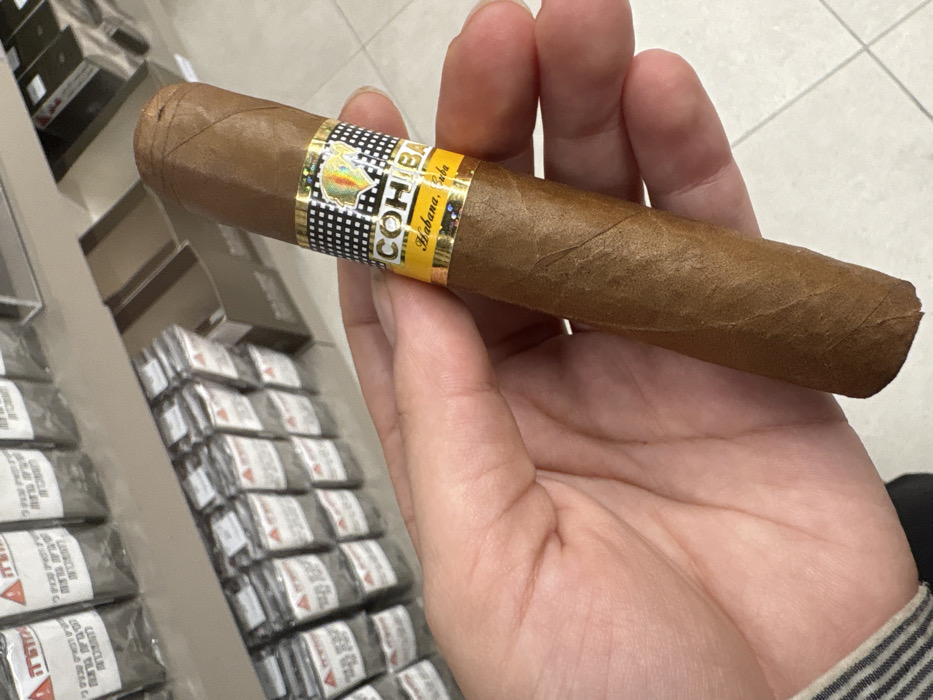 - "A left hand holds a single Cohiba Espléndido cigar, approximately 7 inches long and light brown in color, featuring visible wrapper veins and a triple cap" by FM-ohcgk2, licensed under CC BY 4.0