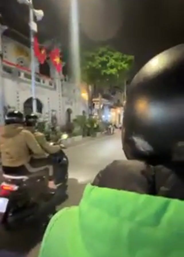 night scene from the perspective of someone riding on the back of a scooter. The person in front is wearing a black helmet and the videographer is wearing a bright green jacket. They are driving down a narrow street lit by streetlights. There are buildings lining the street, some with shops and lights visible. Several people are walking on the sidewalk. There is at least one Vietnamese flag visible. Other scooters are parked on the side of the road and driving nearby.