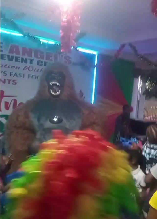 group of young children gathered around a person in a gorilla costume. The costume is mostly brown and gray. The gorilla is standing on a small stage, in front of a white banner with red and green accents. The banner reads “Kole Angel’s Purpose Event Centre.” There are green Christmas decorations on the stage, including a small Christmas tree. Some of the children are reaching towards the gorilla. The lighting changes color during the video, but is mostly light blue, pink, and green. One person in the crowd is wearing a rainbow-colored wig. An individual is also playing music in the background. The children appear to be dancing and enjoying themselves. The general atmosphere is festive and lively.