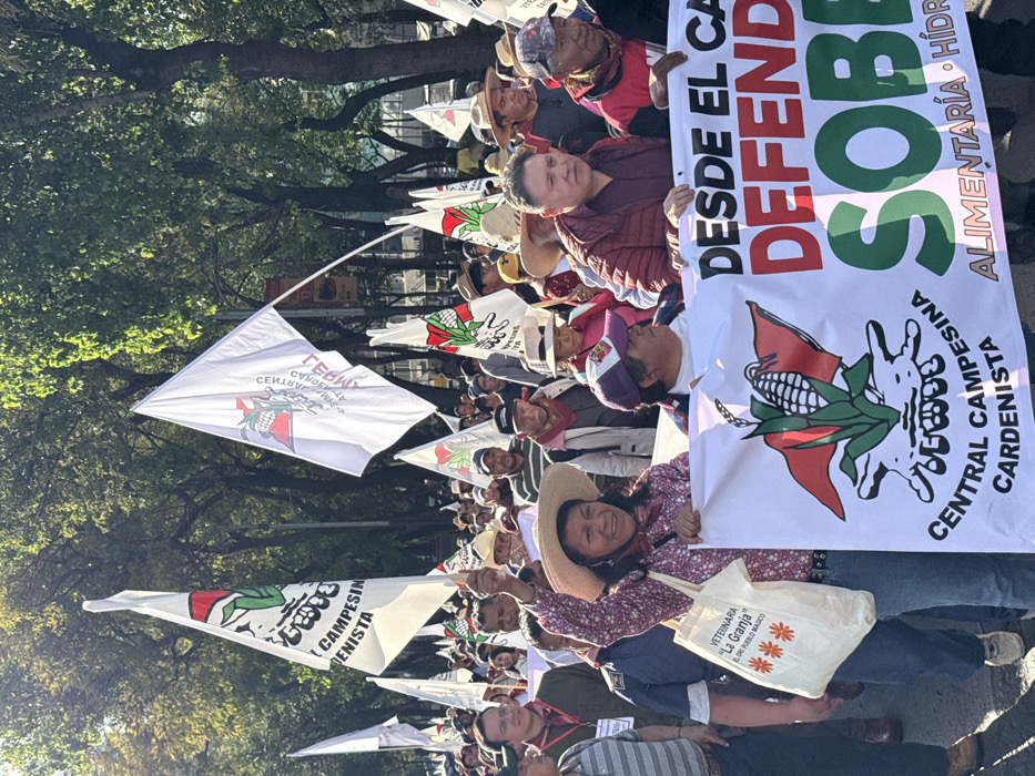 A crowd of people march, holding flags and banners. The flags are white with a stylized image of corn and text "Central Campesina Cardenista." Banners read "Desde el Ca Defend Soberanía Alimentaria Hídrica." One woman carries a white tote bag with "Veterinaria La Granja El Pueblo Mágico" and orange flower icons. The event appears to be a demonstration or march related to agricultural and food sovereignty, potentially in Mexico, based on the Spanish text.