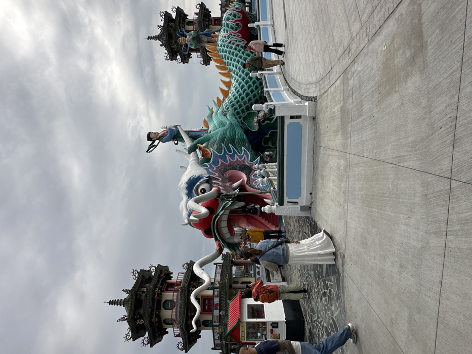 A vibrant dragon statue with a red mouth and green scales dominates the frame, part of a larger complex including a pagoda-style structure. Several people are observing or interacting with the statue. The setting appears to be an outdoor tourist destination under an overcast sky. The orientation of the image is vertical and slightly rotated.