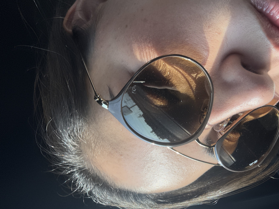 A person with sunglasses viewed from a close angle. The sunglasses reflect a building and sky. The person's skin is pale and lit by sunlight, creating a highlight along the cheek. The angle is slightly off-kilter. The person's ear and some dark hair are visible on the left. The upper lip is visible at the top of the frame.