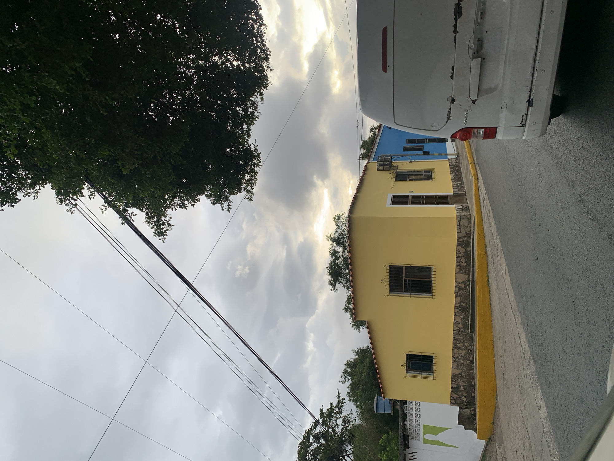 street scene in Tacarigua, Venezuela. A white van is parked on the right side of the asphalt road. A yellow building sits adjacent to the street, featuring dark-grilled windows. Adjacent to it, further back, is a blue building. Power lines extend across the sky in the upper left. A large tree branch with dense foliage occupies the upper left of the frame. The sky is overcast with a mix of light and dark clouds.